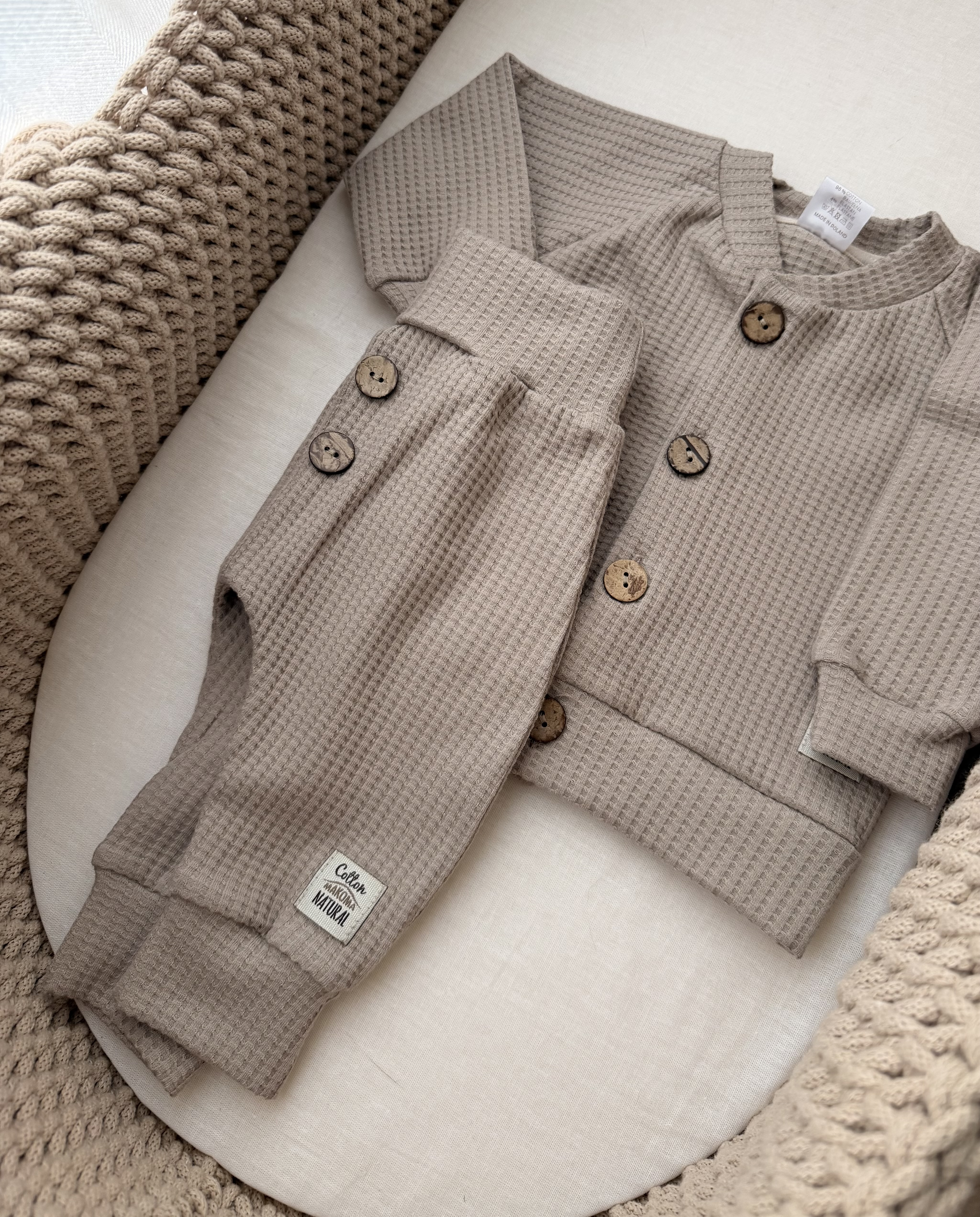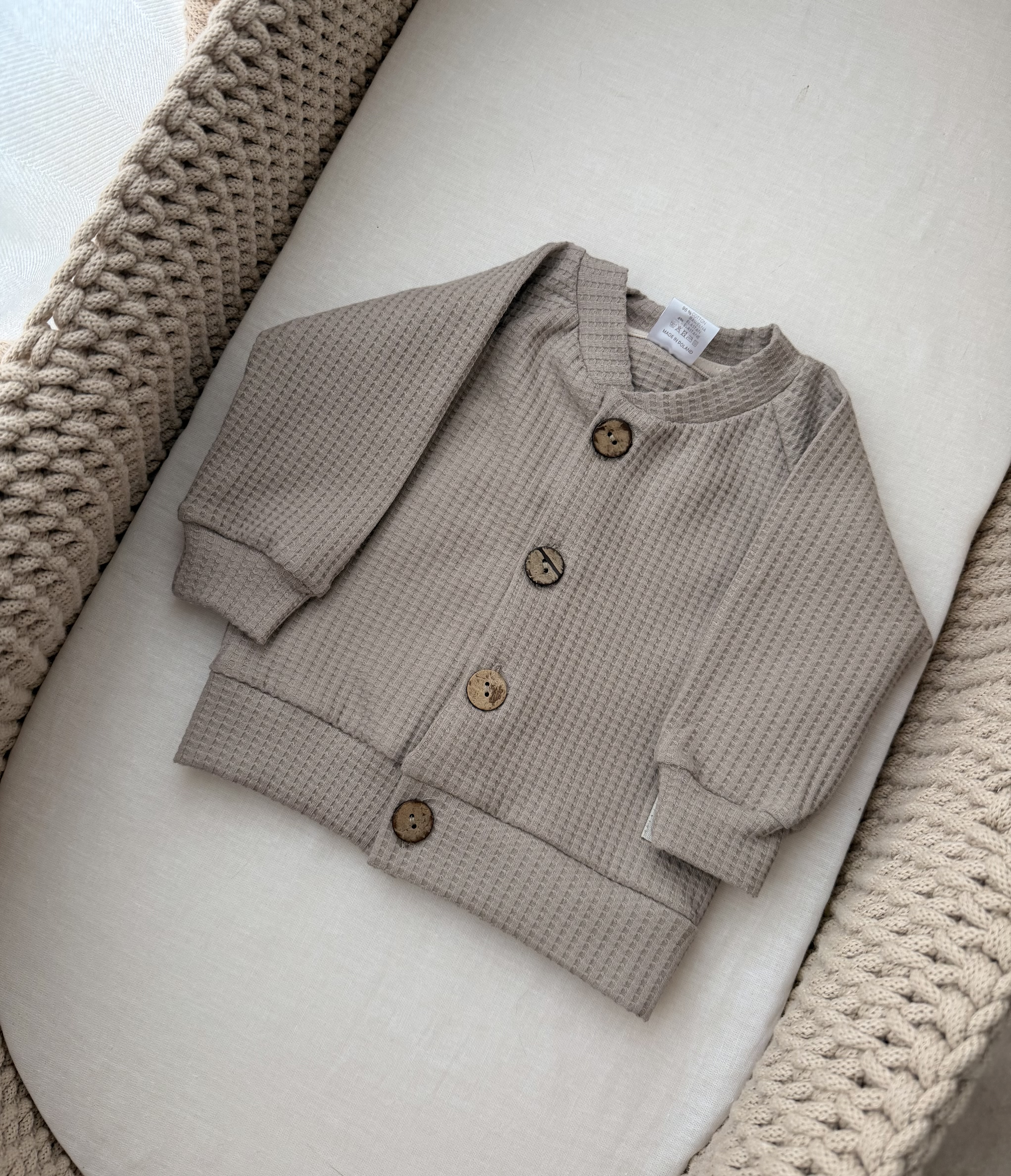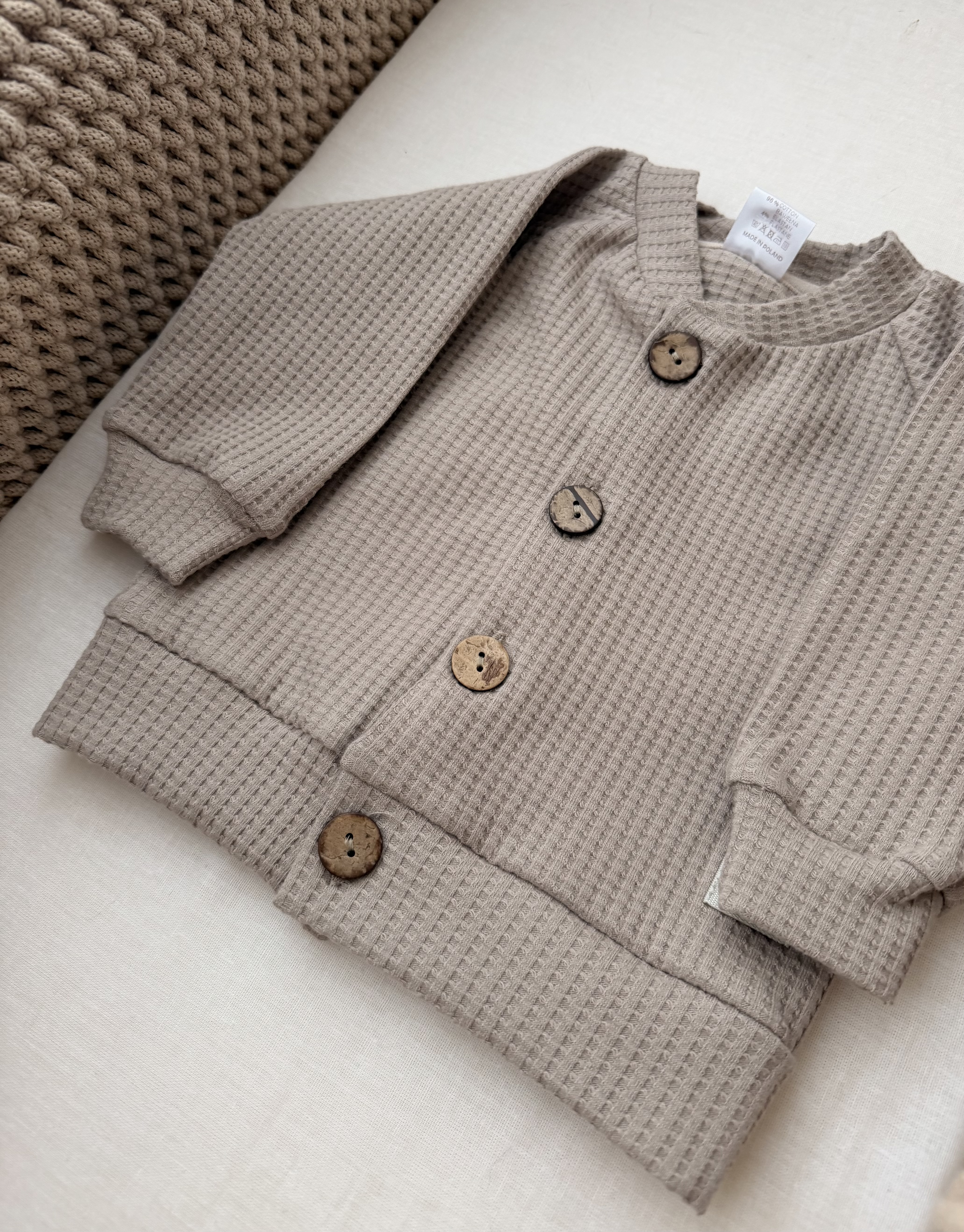 Rozpinany sweter wykonany z dzianiny wafel. Swobodny krój zapewnia dziecku komfort noszenia i nie krępuje ruchów podczas zabawy. Wygodne rozpięcie umożliwia wygodne ubieranie malucha. Na naszej stronie również dostępne spodnie do kompletu.